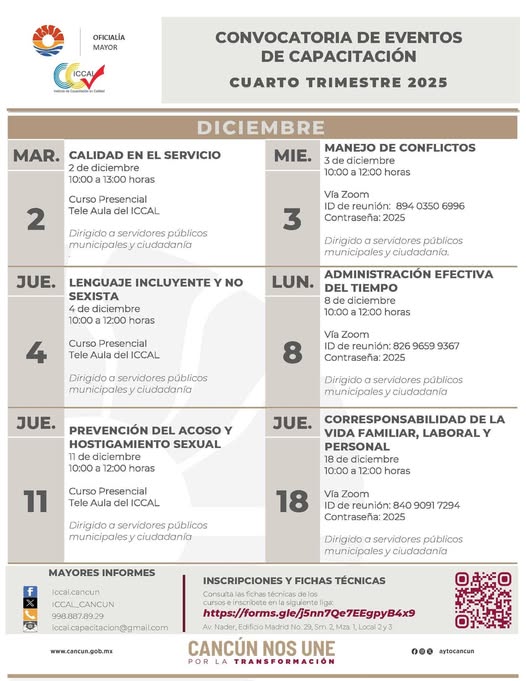 Cancún, Q. R., 01 de diciembre de 2025.- El Ayuntamiento de Benito Juárez, a través del Instituto de Capacitación en Calidad (ICCAL), anunció el cierre del ciclo de formación correspondiente al cuarto cuatrimestre del año con una serie de cursos gratuitos que se impartirán del 2 al 18 de diciembre. La iniciativa busca fortalecer las competencias de servidores públicos y ciudadanos interesados en temas de calidad, equidad y desarrollo personal.