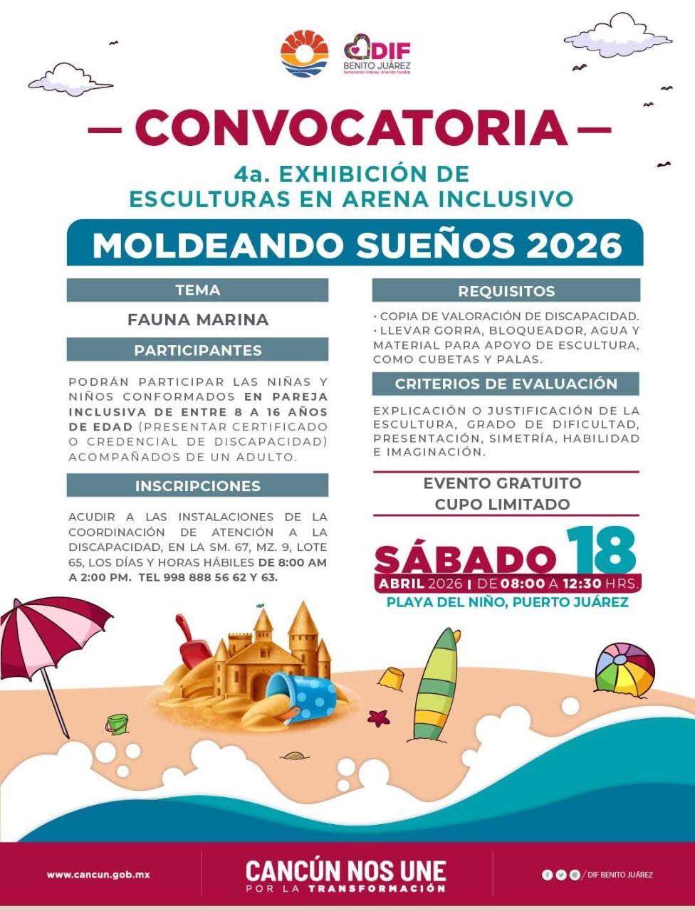 Cancún, Q. R., 5 de abril de 2026.– El Sistema para el Desarrollo Integral de la Familia (DIF) Benito Juárez anunció la realización de la 4ta. Exhibición de Esculturas en Arena Inclusiva “Moldeando Sueños 2026”, un evento que reafirma el compromiso del municipio con la inclusión, la creatividad y el fortalecimiento del tejido social. La actividad se llevará a cabo el 18 de abril en Playa del Niño, en Puerto Juárez, y está dirigida a niñas, niños y adolescentes con discapacidad.
