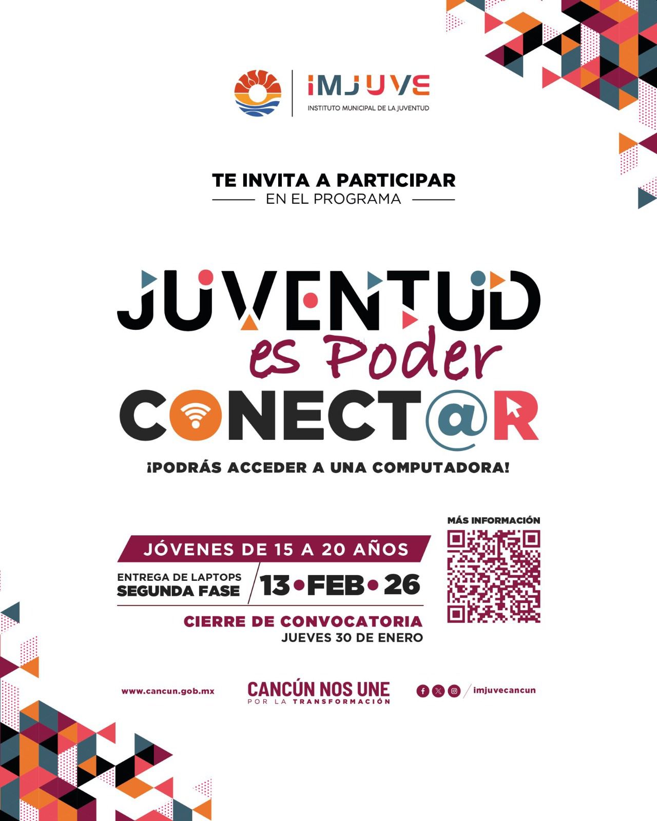 Para más información, los interesados pueden consultar cancun.gob.mx/convocatorias, llamar al 998 493 1913, o visitar las redes oficiales del IMJUVE.