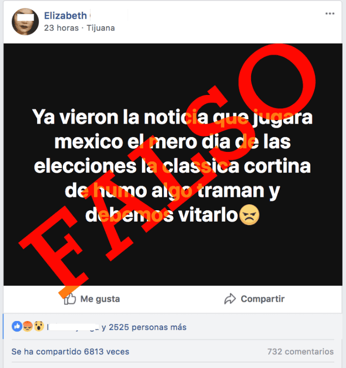 “Ya vieron la noticia que jugará México el mero día de las elecciones la clásica cortina de humo algo traman y debemos evitarlo”, se lee en una publicación de Facebook compartida seis mil 813 veces, que posteriormente fue eliminada, sin embargo, la información continuó esparciéndose por la red.