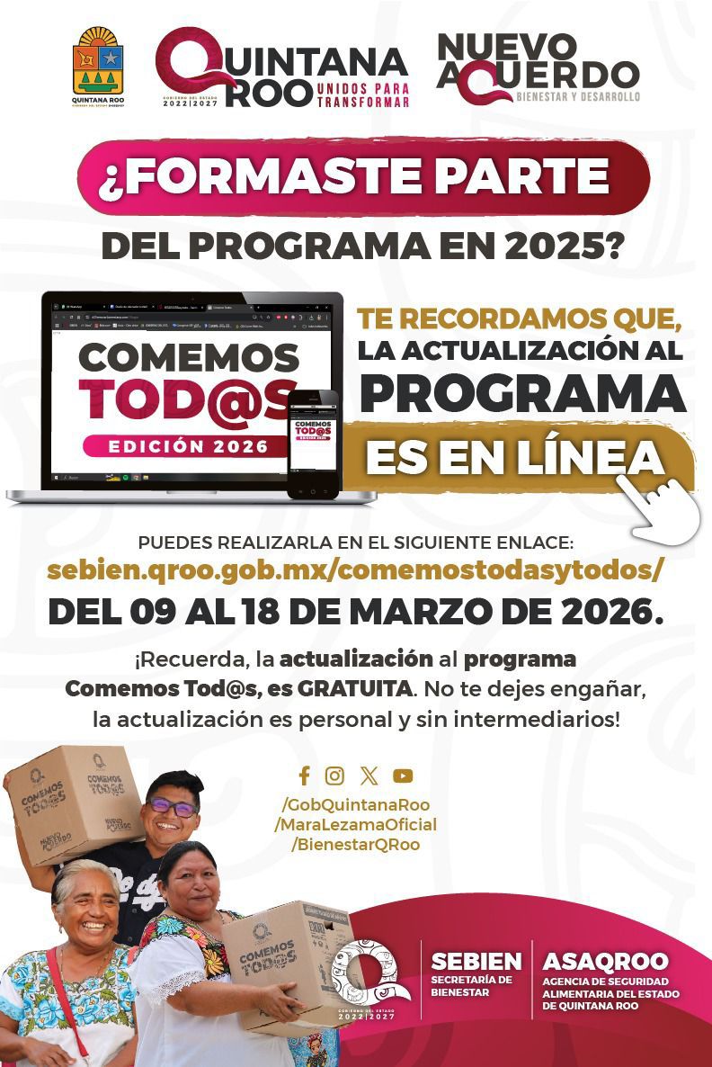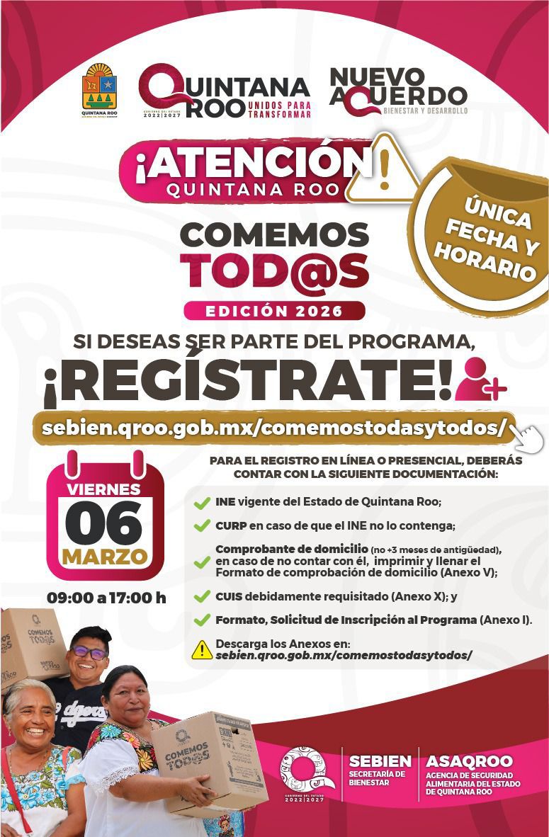 La gobernadora de Quintana Roo, Mara Lezama Espinosa, anunció el inicio del registro para el programa social “Comemos Todas y Todos 2026”, una de las estrategias más importantes de su administración para fortalecer la seguridad alimentaria y apoyar la economía de miles de hogares en el estado. El proceso de inscripción se realiza este 6 de marzo, de 9:00 a 17:00 horas, tanto en módulos instalados en los 11 municipios como en la plataforma digital de la Secretaría de Bienestar.
