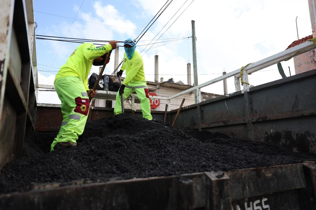 Para los trabajos se utilizó asfalto frío, un material que permite una aplicación rápida, sin necesidad de emulsión y con la ventaja de poder colocarse incluso en condiciones de lluvia. El procedimiento incluyó corte de la vialidad a cinco centímetros de profundidad, limpieza del área, colocación del material y compactación final.