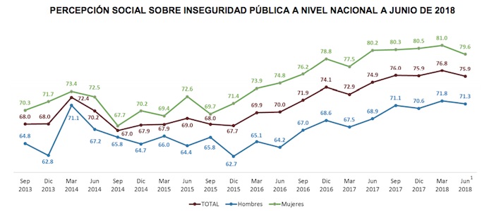 En dicha encuesta, la cual no representa un cambio significativo respecto a marzo de 2018 ni a junio de 2017, fue realizada durante la primera quincena de junio, a un 75.9 por ciento de la población de 18 años y más, es decir 7.6 de cada 10 encuestados, consideró que vivir en su ciudad es inseguro.