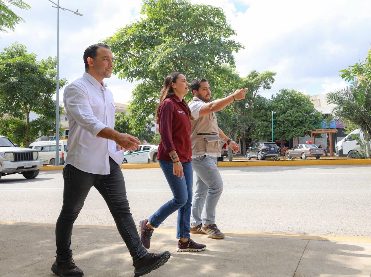 Durante el recorrido, la Alcaldesa destacó que estos espacios responden a una necesidad urgente de la ciudadanía. El primer punto visitado fue el paradero ubicado frente al Mercado Ki Huic, en la bahía con dirección norte, donde explicó que la estructura fue ampliada al doble de su tamaño para brindar protección contra el sol y la lluvia, además de contar con iluminación total y rampas de acceso. También se construyeron 800 metros de andadores interconectados, evitando que los peatones continúen caminando sobre tierra o zonas irregulares.