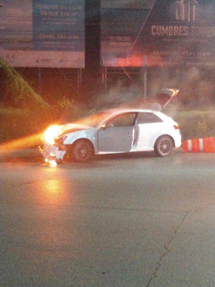 Tres personas salieron con quemaduras del compacto blanco, mientras autoridades capturaron al conductor del Audi, quien estaba totalmente alcoholizado.