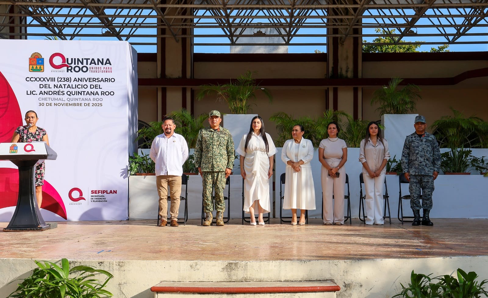 Chetumal.- Con un acto solemne en el Parque de Los Caimanes, el Gobierno del Estado conmemoró el 238 aniversario del natalicio de Andrés Quintana Roo, jurista y prócer de la Independencia de México cuyo nombre da identidad a la entidad. La ceremonia, organizada por la Secretaría de Finanzas y Planeación (SEFIPLAN), reafirmó el compromiso de impulsar valores cívicos y sociales que fortalecen la memoria histórica y el orgullo de pertenencia.
