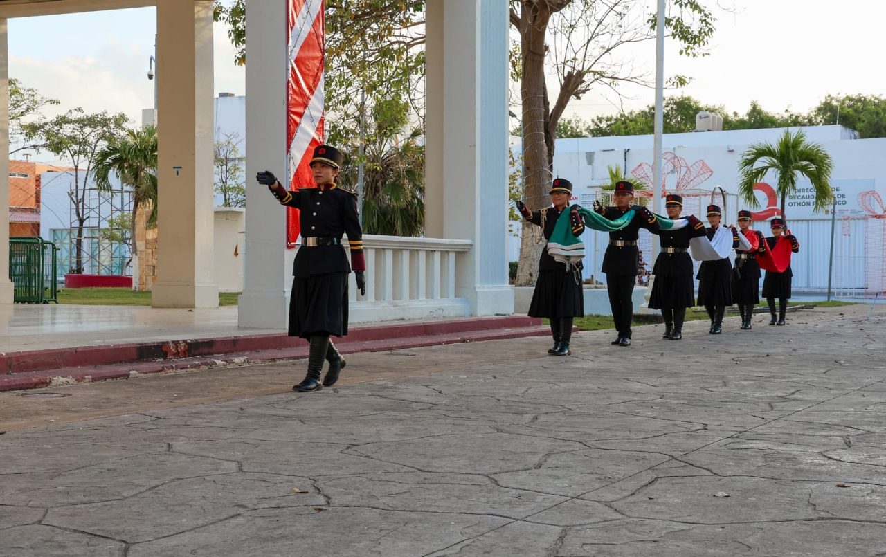 Previo a la ceremonia, la escolta de la organización Linces realizó el izamiento a toda asta de la Bandera Nacional frente al Palacio de Gobierno. Posteriormente, la Banda de Música y el Coro interpretaron “Suéñame Quintana Roo”, junto con los himnos estatal y nacional, mientras los honores a la bandera estuvieron a cargo de la Academia Cívico-Deportiva TITANES y la escolta de Linces.