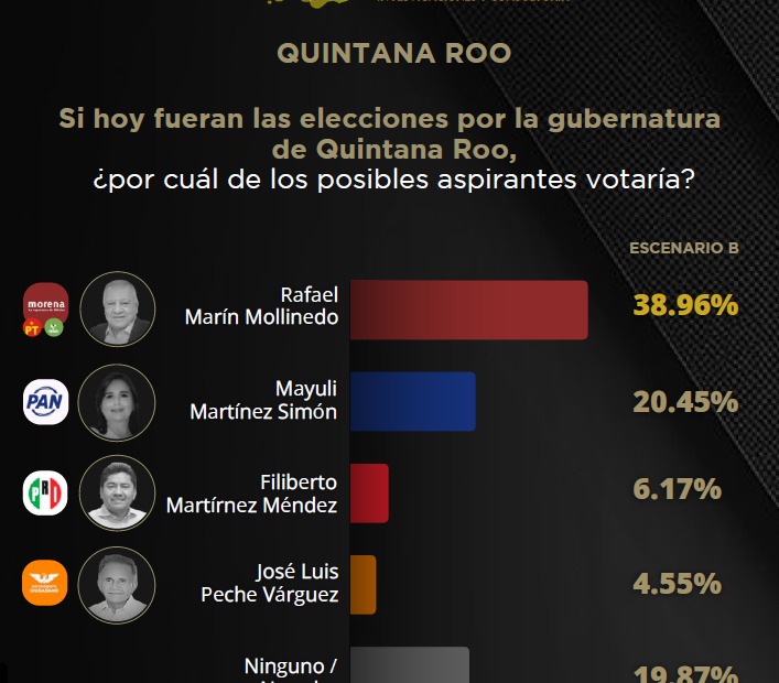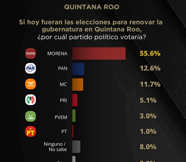 En Quintana Roo, lo que no cambia es la evaluación de la oposición; muy pareja en el sótano. Insisten en colocar al PAN con 12% en promedio, seguido por MC con 11%, mientras al PRI un bajón al 5% y le fue mejor que en otras encuestas.