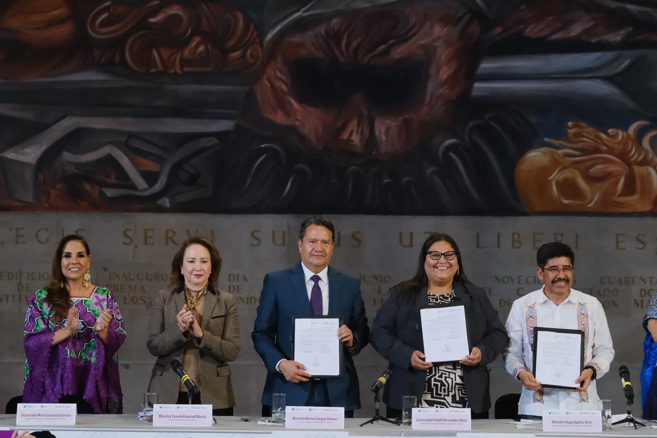 Ciudad de México.– En un hecho considerado trascendental para el fortalecimiento de la justicia con perspectiva de género en México, la gobernadora de Quintana Roo, Mara Lezama Espinosa, participó en la firma del Convenio Marco de Colaboración entre la Suprema Corte de Justicia de la Nación (SCJN), el Órgano de Administración Judicial y la Secretaría de las Mujeres del Gobierno Federal. El acuerdo busca consolidar mecanismos institucionales que garanticen una atención más efectiva, sensible y coordinada para las mujeres en situación de violencia y desigualdad.