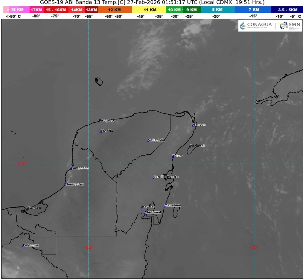 El estado de Quintana Roo amanece este 27 de febrero con cielo despejado, ambiente caluroso y condiciones estables, favorecidas por la entrada de aire cálido y húmedo desde el Caribe. Las temperaturas se mantienen elevadas desde primeras horas del día, mientras que la sensación térmica incrementa por la humedad característica de la región.