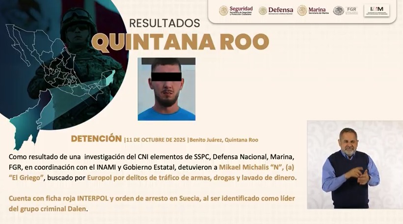 *En La Mañanera de este 11 de noviembre, el secretario de Seguridad y Protección Ciudadana, Omar García Harfuch, informó que se logró la detención en Cancún del narcotraficante europeo, Mikael Michalis “N” alias “El Griego”.