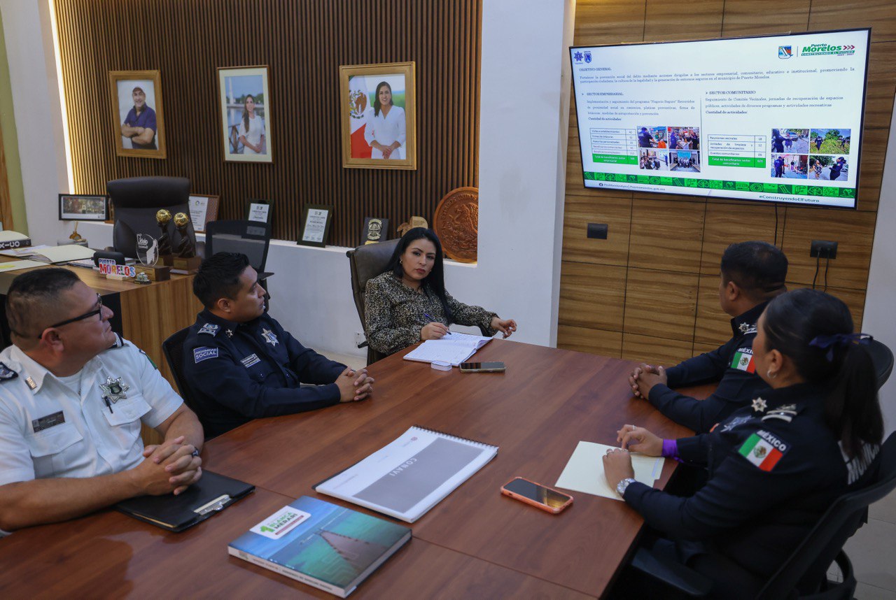 Puerto Morelos, Quintana Roo.— La presidenta municipal Blanca Merari Tziu encabezó la evaluación trimestral de la Secretaría de Seguridad Ciudadana, en la que se presentaron avances operativos, resultados en materia de prevención y el fortalecimiento de las capacidades institucionales durante los primeros meses de 2026. El encuentro estuvo dirigido por el titular de la corporación, Tte. de Navío Alejandro Nava García, acompañado de directores de las distintas áreas operativas.