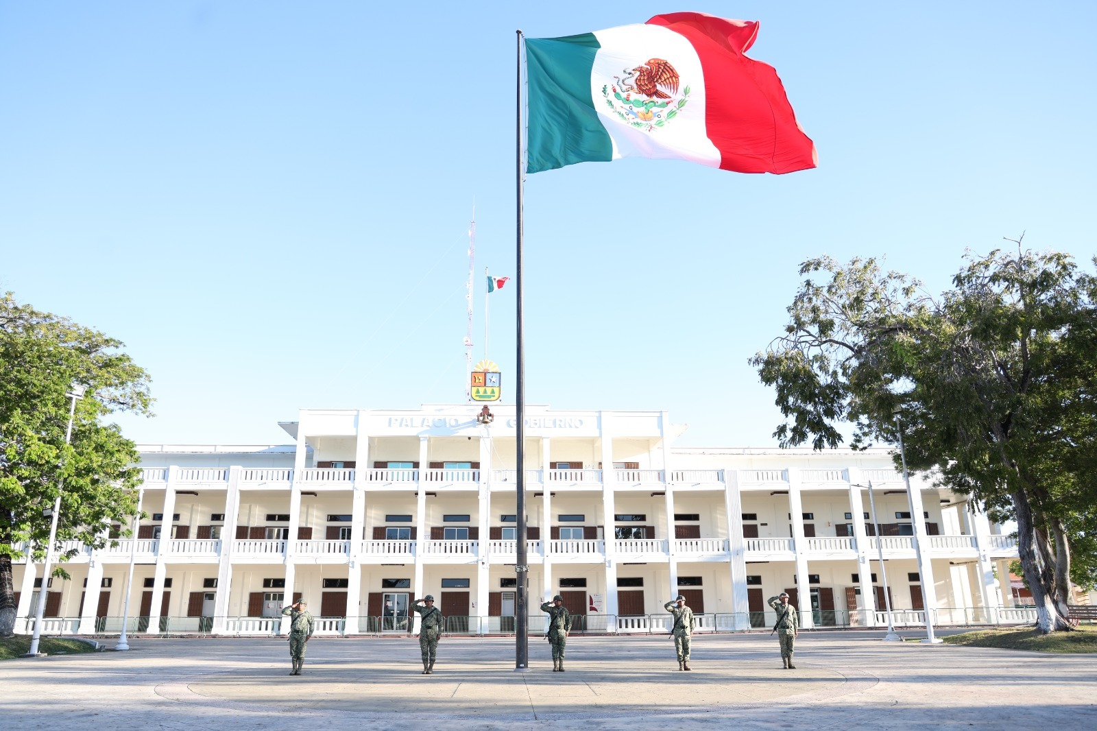 Como parte del protocolo, elementos de la 34 Zona Militar realizaron el izamiento de la Bandera Nacional a toda asta frente al Palacio de Gobierno. La Banda de Música y el Coro del Estado interpretaron la “Marcha a Juárez y la Constitución”, así como los himnos a Quintana Roo y el Himno Nacional Mexicano. Los honores a la Bandera estuvieron a cargo de la Banda de Guerra de la Secretaría de Seguridad Ciudadana y la Escolta de la 34 Zona Militar.
