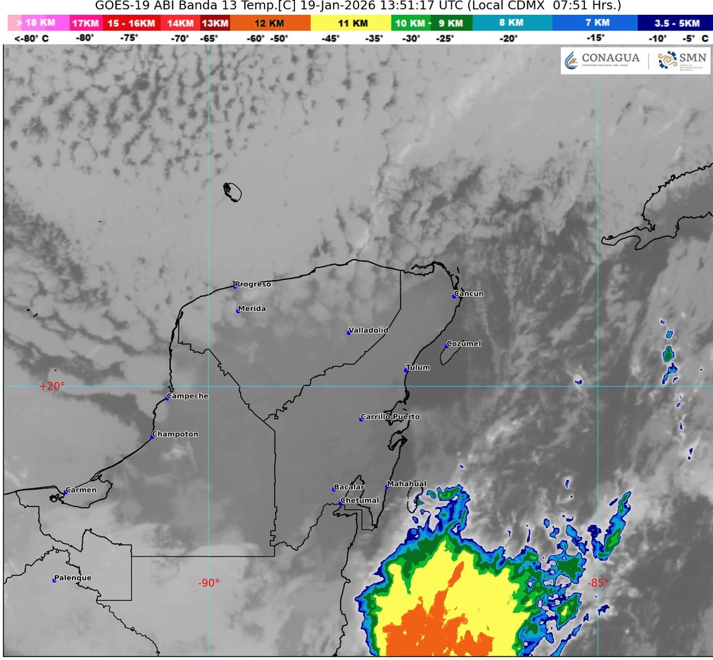 Quintana Roo inicia este 19 de enero de 2026 con condiciones dominadas por nublados, lluvias intermitentes y un ambiente fresco debido a la influencia de un sistema frontal que continúa afectando la región. Durante la mañana prevalece un clima templado, mientras que por la tarde se espera un ligero ascenso en la temperatura, aunque la sensación térmica seguirá moderada por la humedad y el viento.