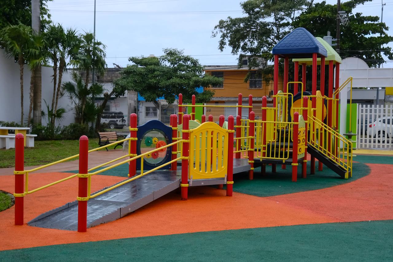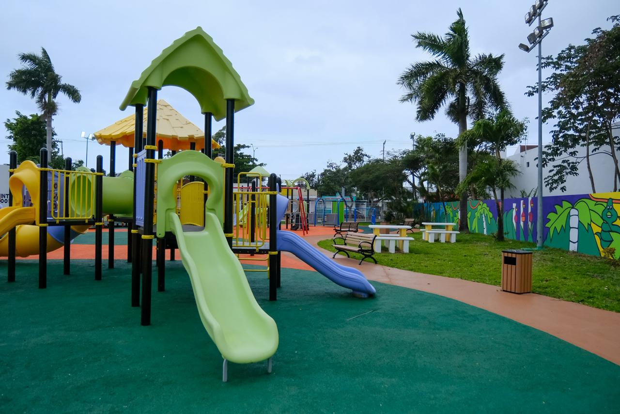 La intervención integral incluyó la instalación de 600 metros cuadrados de piso de caucho en el área de juegos, renovación total del pasto, colocación de juegos inclusivos, rehabilitación de baños, trabajos de pintura, instalación de bancas, botes de basura y la adecuación de un área de picnic. Estas acciones permiten que niñas, niños, adolescentes y familias cuenten nuevamente con un espacio recreativo accesible y funcional.