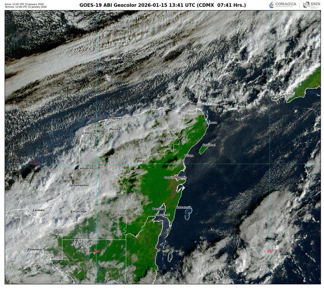 Quintana Roo inicia este jueves 15 de enero de 2026 con cielo mayormente nublado, ambiente fresco y efectos del evento de “Norte”, que continúa generando vientos moderados en la zona costera. Las temperaturas se mantienen estables, con valores templados durante la mañana y ligeramente más cálidos hacia el mediodía. La humedad permanece elevada y existe probabilidad de lluvias aisladas en distintos puntos del estado.