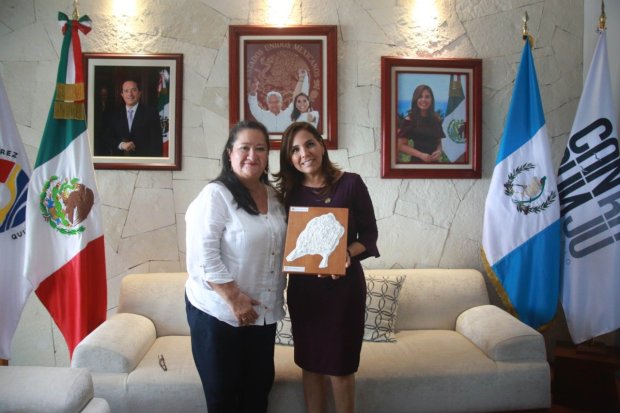Al finalizar el encuentro, la representante popular de Guatemala obsequió a la Presidente Municipal una maqueta de la réplica de la isla que representa y una bolsa bordada por mujeres indígenas del altiplano, y a su vez, la Presidente Municipal de Benito Juárez entregó un adorno con las letras de colores del mirador fotográfico de Playa Delfines que forma la palabra Cancún y que al consumirse tiene semillas que pueden sembrarse.