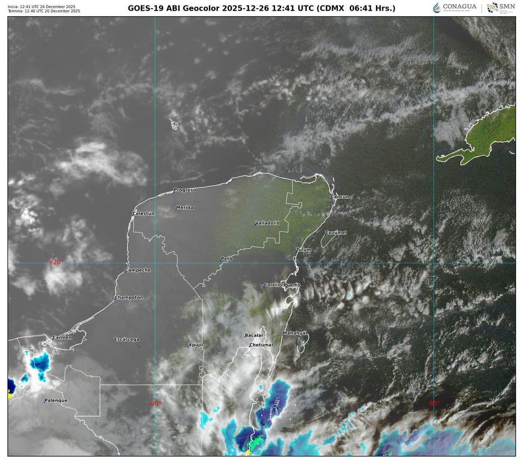 Este viernes 26 de diciembre, el estado de Quintana Roo amaneció con cielos mayormente nublados y lluvias intermitentes debido a la presencia de una vaguada que afecta gran parte de la Península de Yucatán. El ambiente se mantiene templado, con temperaturas que oscilan entre los 26°C y 28°C, mientras que la sensación térmica es ligeramente menor por la humedad y los vientos del Este.