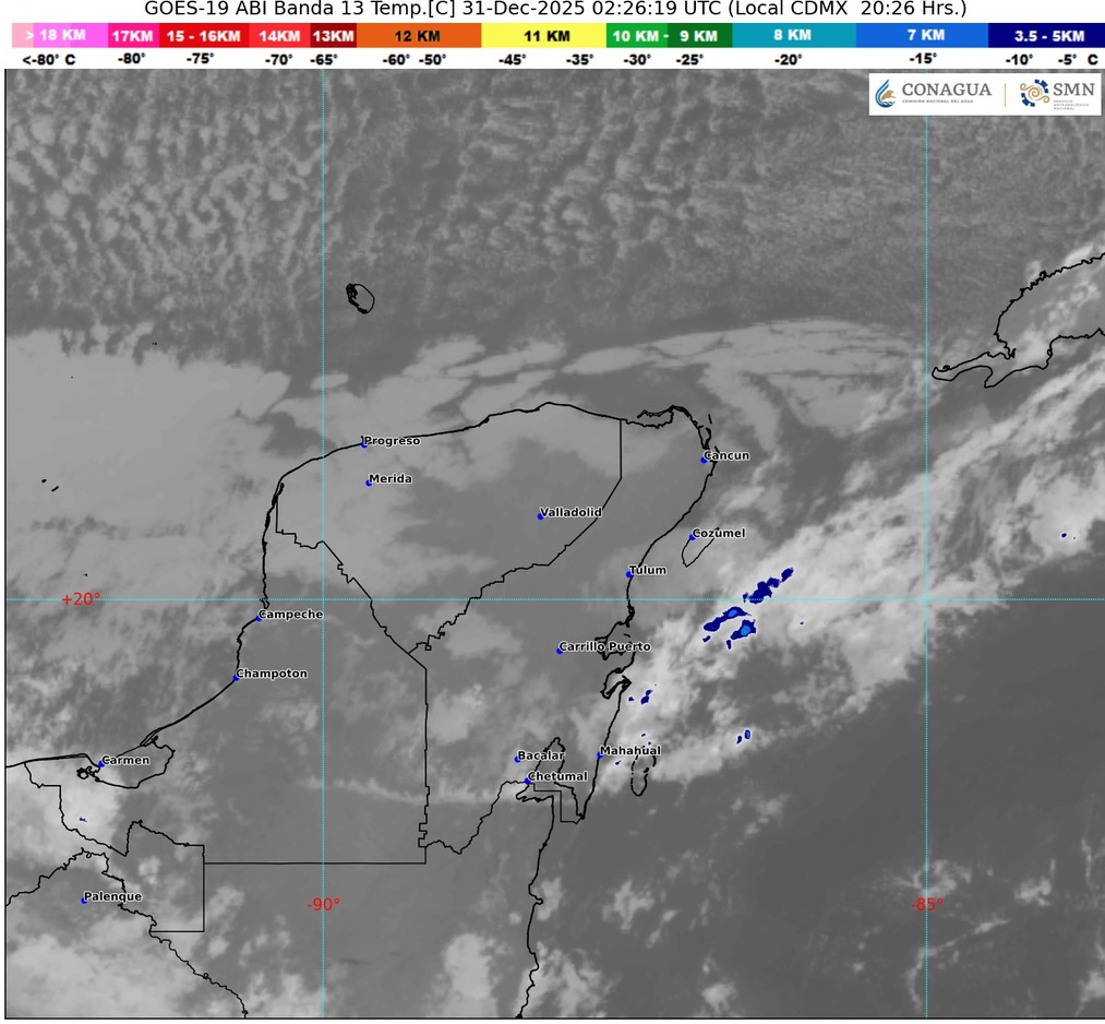Chetumal, Quintana Roo. Este martes 30 de diciembre de 2025, el estado caribeño amanece con cielos nublados, lluvias intermitentes y ambiente templado, producto de la interacción del frente frío número 25 y un canal de baja presión sobre la Península de Yucatán. Las autoridades recomiendan precaución ante posibles tormentas eléctricas y acumulados de lluvia moderada a fuerte.