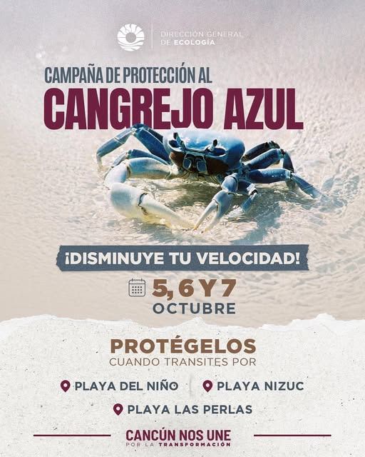 Cancún, Q. R., 3 de octubre de 2025.— El Ayuntamiento de Benito Juárez, a través de la Dirección de Ecología Municipal, anunció la segunda fecha de la campaña de protección al cangrejo azul, que se llevará a cabo del 5 al 7 de octubre. Esta acción busca resguardar a la especie durante su migración nocturna desde la laguna hacia el mar para cumplir su ciclo reproductivo.