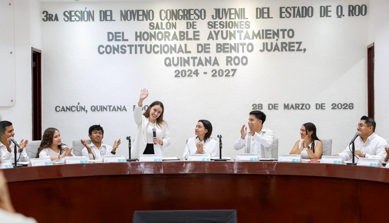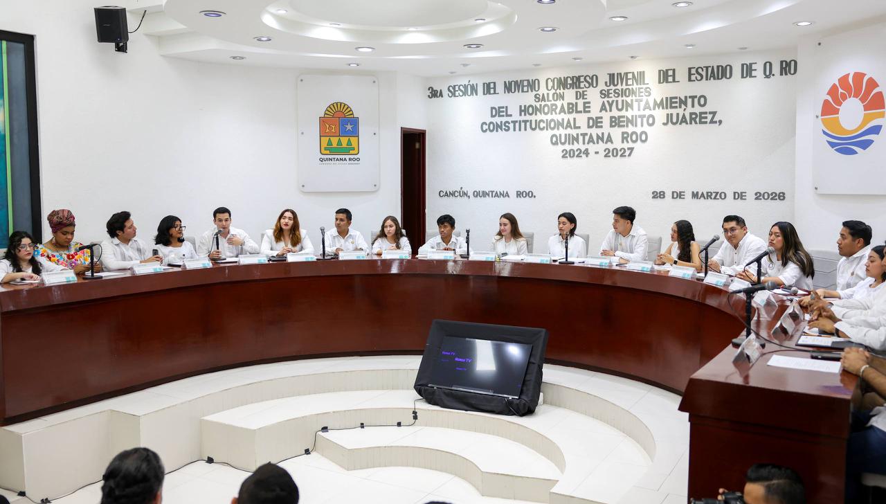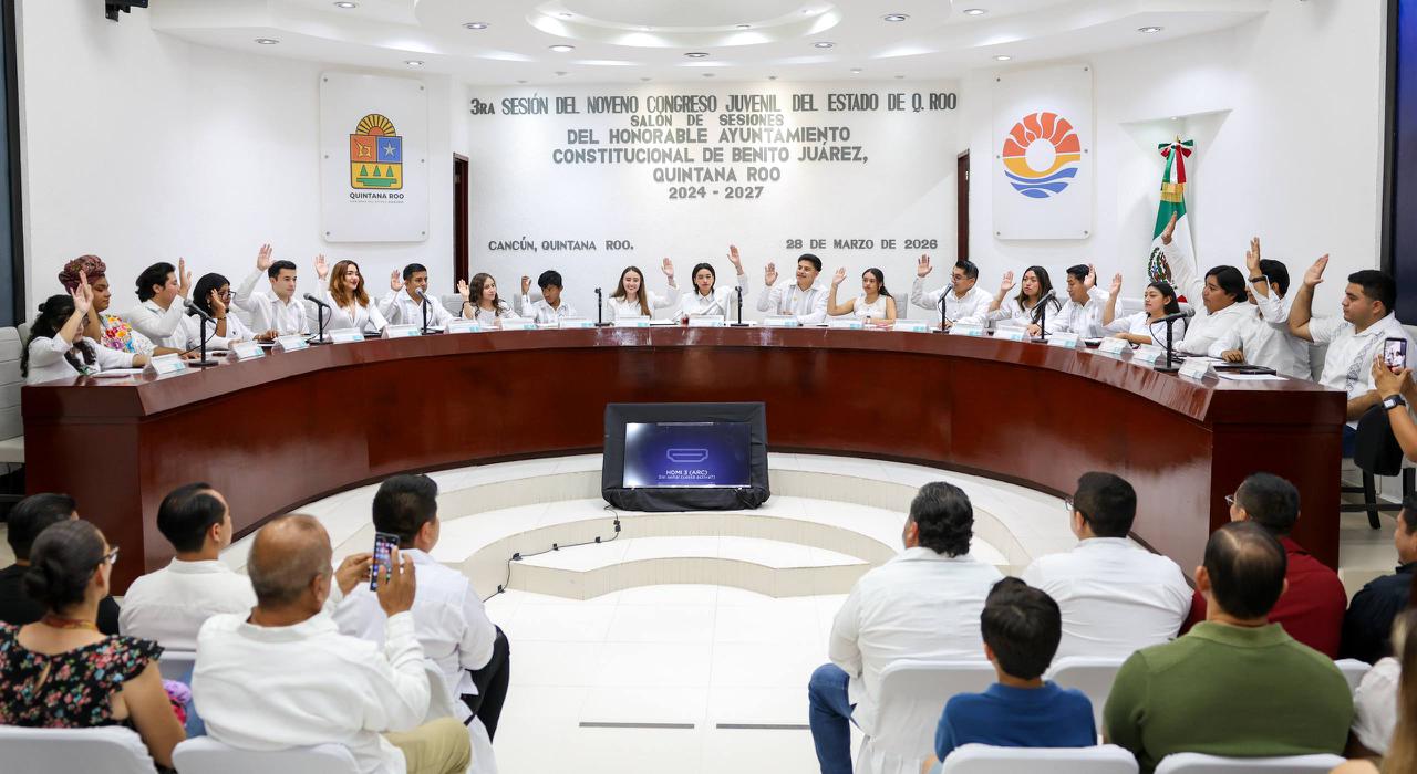 Cancún, Q. R., 29 de marzo de 2026.– Con una participación activa y comprometida, jóvenes provenientes de diversos municipios del estado formaron parte de la 3ra. Sesión del Noveno Congreso Juvenil 2026, realizada en el recinto “20 de Abril” del Palacio Municipal de Benito Juárez. El encuentro tuvo como propósito fortalecer la vida democrática, promover el liderazgo juvenil y abrir espacios de diálogo que permitan construir propuestas en beneficio de Quintana Roo.
