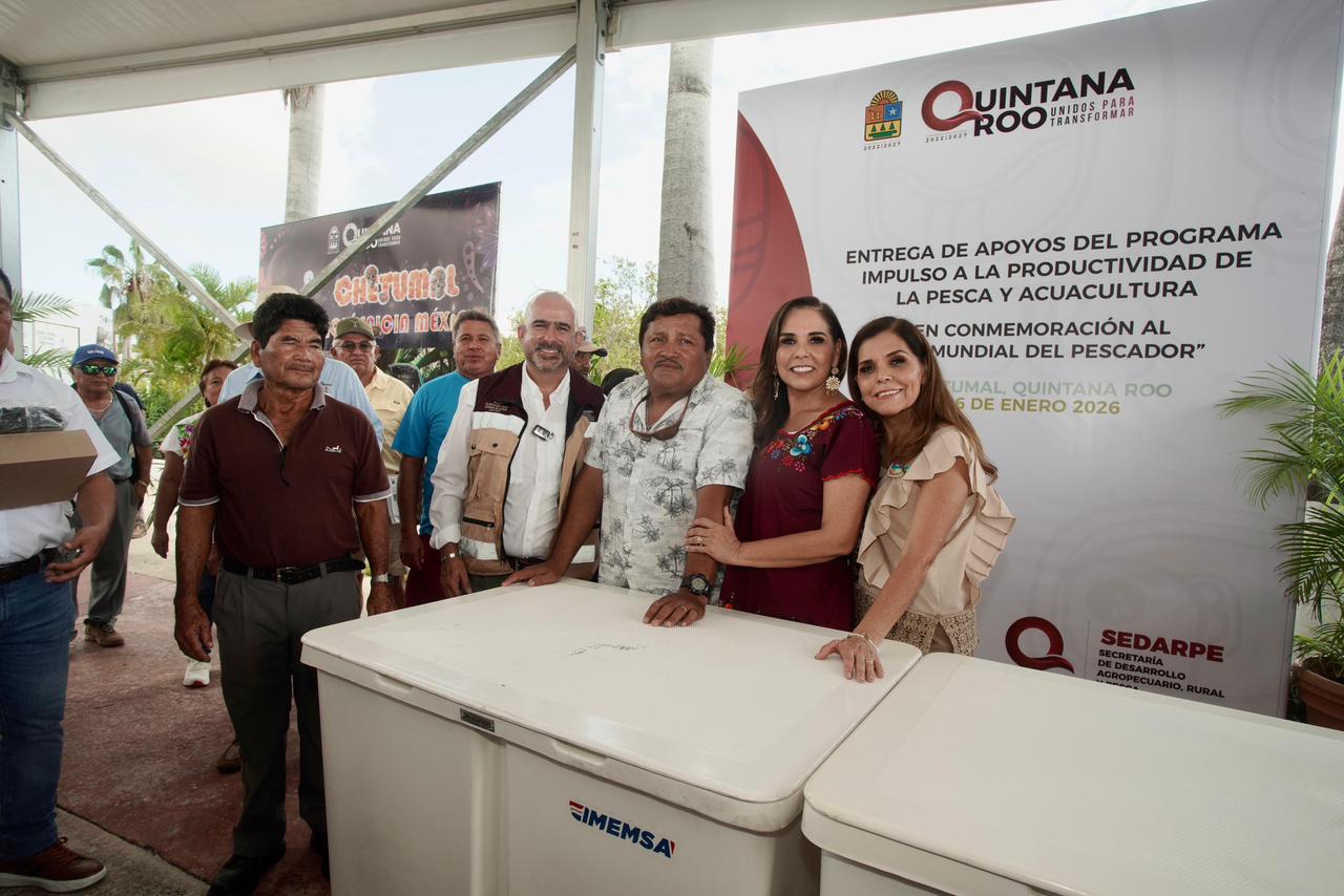 Con motivo del Día Mundial del Pescador, la gobernadora de Quintana Roo, Mara Lezama Espinosa, encabezó en Chetumal una entrega histórica de apoyos productivos para pescadoras y pescadores de Bacalar, Othón P. Blanco, Felipe Carrillo Puerto y Tulum. A través del Programa Impulso a la Productividad de la Pesca y la Acuacultura de la SEDARPE, se distribuyeron motores ecológicos, embarcaciones, remolques, equipos de seguridad, GPS y neveras, con una inversión superior a los 8 millones de pesos.