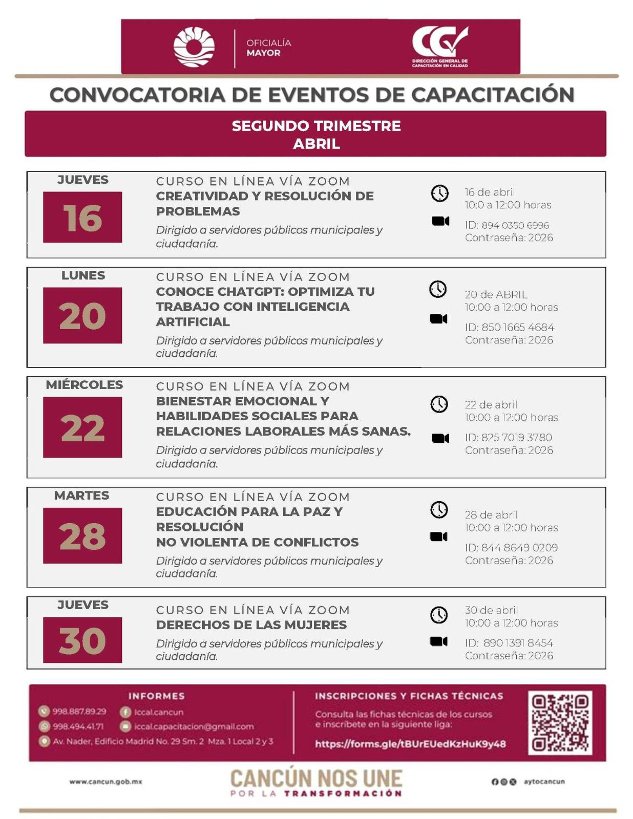 El programa inicia el jueves 16 de abril con el curso “Creatividad y resolución de problemas”, enfocado en desarrollar habilidades para enfrentar retos cotidianos con pensamiento innovador. Posteriormente, el miércoles 22 de abril se impartirá “Bienestar emocional y habilidades sociales para relaciones laborales más sanas”, dirigido a fortalecer la comunicación y la gestión emocional en equipos de trabajo. Para el martes 28 de abril está programado “Educación para la paz y resolución no violenta de conflictos”, cuyo objetivo es fomentar prácticas de convivencia pacífica.