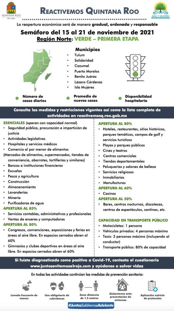 La zona norte del estado de Quintana Roo se mantiene en semáforo epidemiológico verde en primera etapa, esta región comprende los municipios de Solidaridad, Cozumel, Isla Mujeres, Tulum, Lázaro Cárdenas, Puerto Morelos y Benito Juárez, la tasa de contagios es de 0.92 puntos, en tanto la ocupación hospitalaria disminuyo y se encuentra ahora en 9 por ciento en camas en general y del 6 por ciento en camas con ventilador.