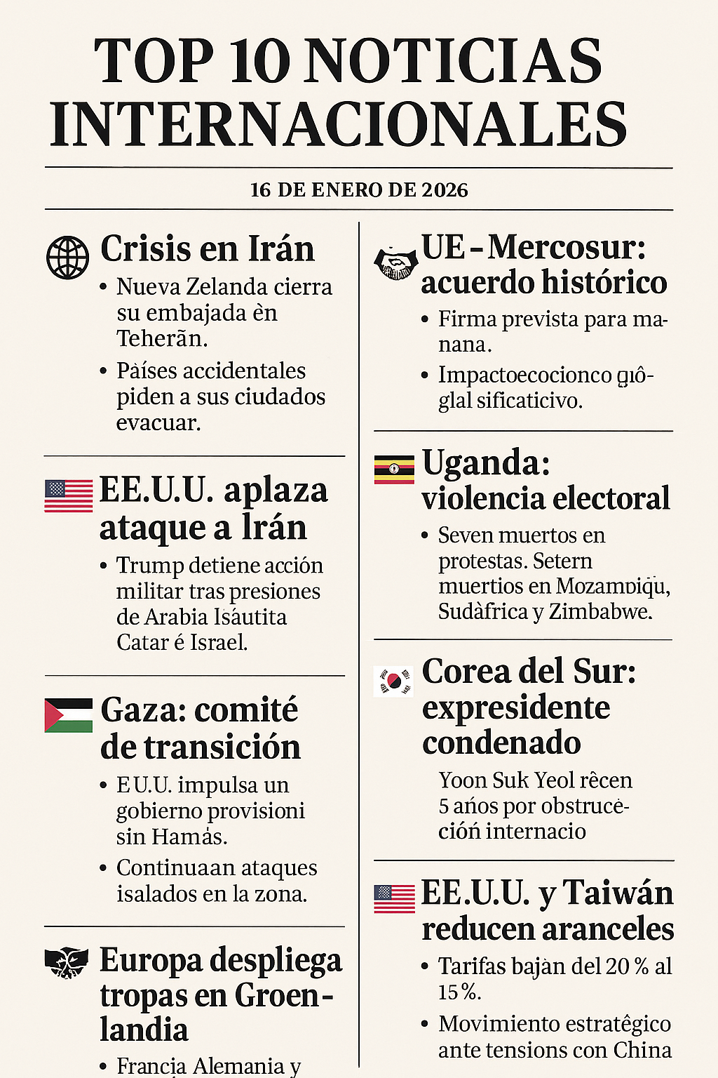 16 de enero de 2026. La jornada internacional estuvo marcada por tensiones geopolíticas, reacomodos diplomáticos, crisis humanitarias y movimientos estratégicos entre potencias globales. A continuación, un recuento de los diez hechos más relevantes que definieron el pulso del mundo en las últimas horas.