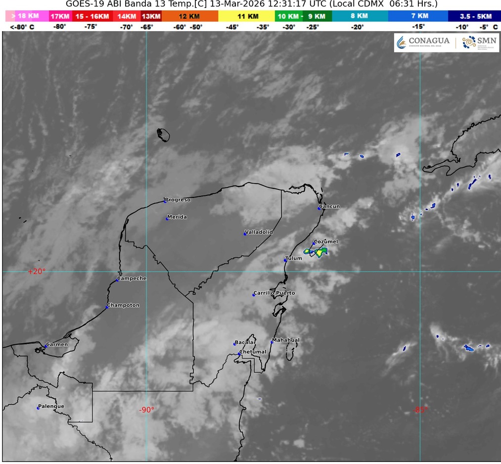 Quintana Roo amanece este 12 de marzo de 2026 con cielo mayormente soleado, humedad elevada y un ambiente caluroso desde primeras horas. La temperatura actual ronda los 25°C, mientras que la sensación térmica alcanza 31°C, impulsada por la humedad del 80%. Para el resto del día se espera un ambiente muy cálido, con máximas cercanas a 34°C y baja probabilidad de lluvia.