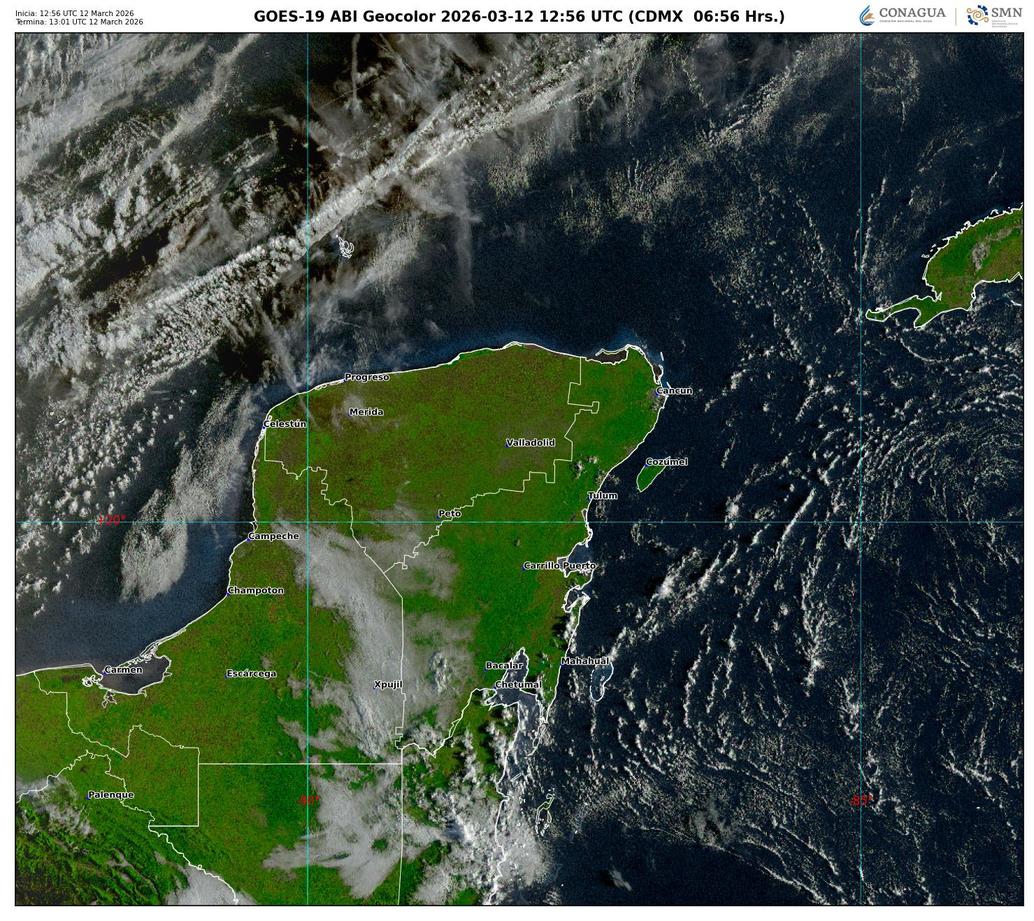 Quintana Roo amanece este 12 de marzo de 2026 con cielo mayormente soleado, humedad elevada y un ambiente caluroso desde primeras horas. La temperatura actual ronda los 25°C, mientras que la sensación térmica alcanza 31°C, impulsada por la humedad del 80%. Para el resto del día se espera un ambiente muy cálido, con máximas cercanas a 34°C y baja probabilidad de lluvia.