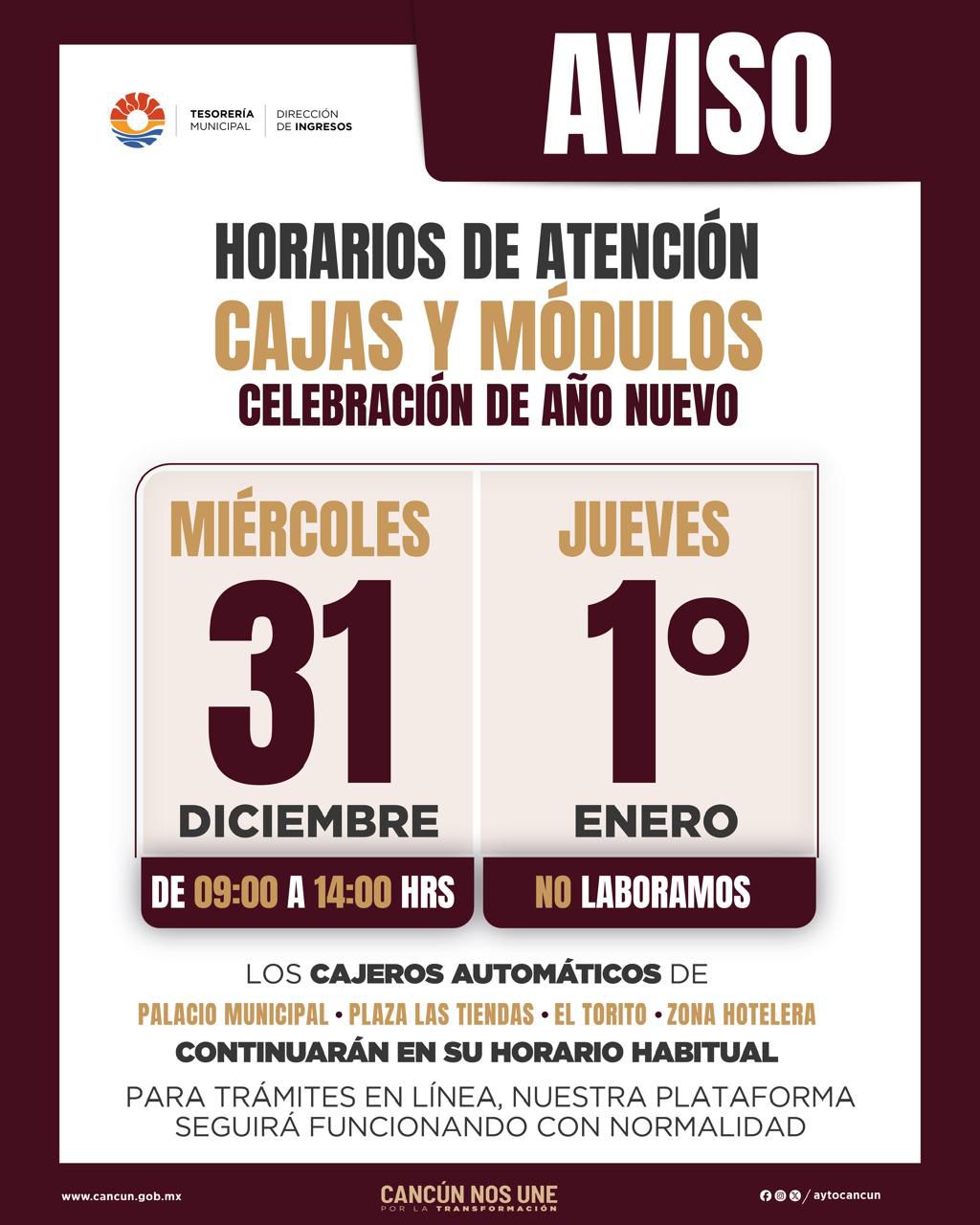 Cancún, Q. R., a 30 de diciembre de 2025.- El Ayuntamiento de Benito Juárez anunció modificaciones en los horarios de atención de cajas y módulos previo a la celebración de Año Nuevo, con el objetivo de brindar comodidad y alternativas seguras a los contribuyentes.