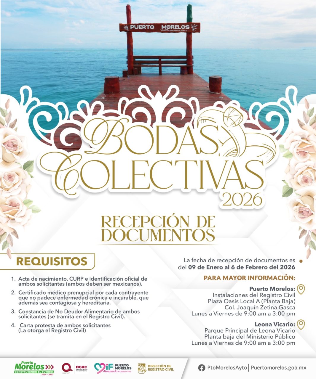 El municipio de Puerto Morelos anunció oficialmente la apertura del registro para las Bodas Colectivas 2026, un programa impulsado por el Sistema DIF y el Registro Civil que busca brindar certeza jurídica a las parejas y fortalecer el núcleo familiar como base del desarrollo social. La presidenta municipal, Blanca Merari Tziu Muñoz, informó que la convocatoria permanecerá abierta hasta el 6 de febrero de 2026, invitando a todas las parejas interesadas a formalizar su unión en un evento que se ha convertido en una tradición significativa para la comunidad.
