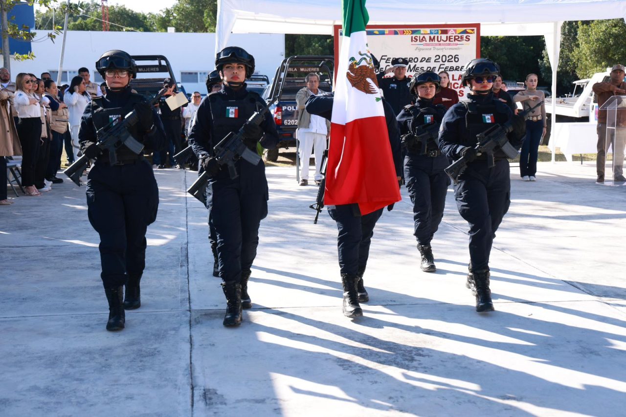 Isla Mujeres, Quintana Roo, 4 de febrero de 2026.— Durante la ceremonia de honores a la bandera correspondiente al mes de febrero, realizada en la Secretaría Municipal de Seguridad Ciudadana, el Gobierno Municipal presentó un balance detallado de los avances más significativos en materia de seguridad pública y fortalecimiento institucional.