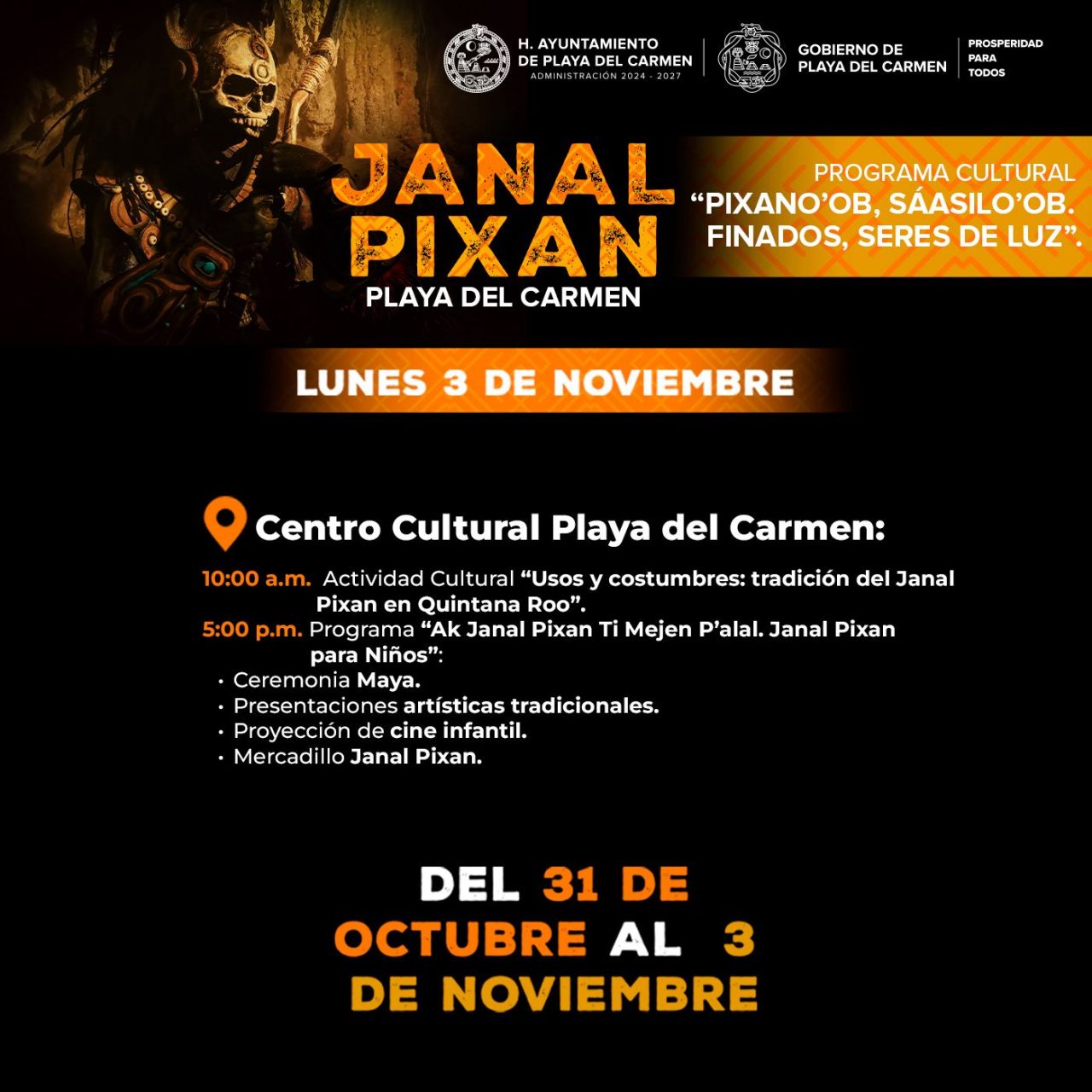 Playa del Carmen, Quintana Roo, 30 de octubre de 2025.— Este viernes 31 de octubre inicia en Playa del Carmen el Janal Pixan 2025, bajo el lema “Pixano’ob Sáasilo ‘ob. Finados seres de luz”, con una programación cultural gratuita que honra a los Fieles Difuntos y fortalece las raíces mayas de la región.