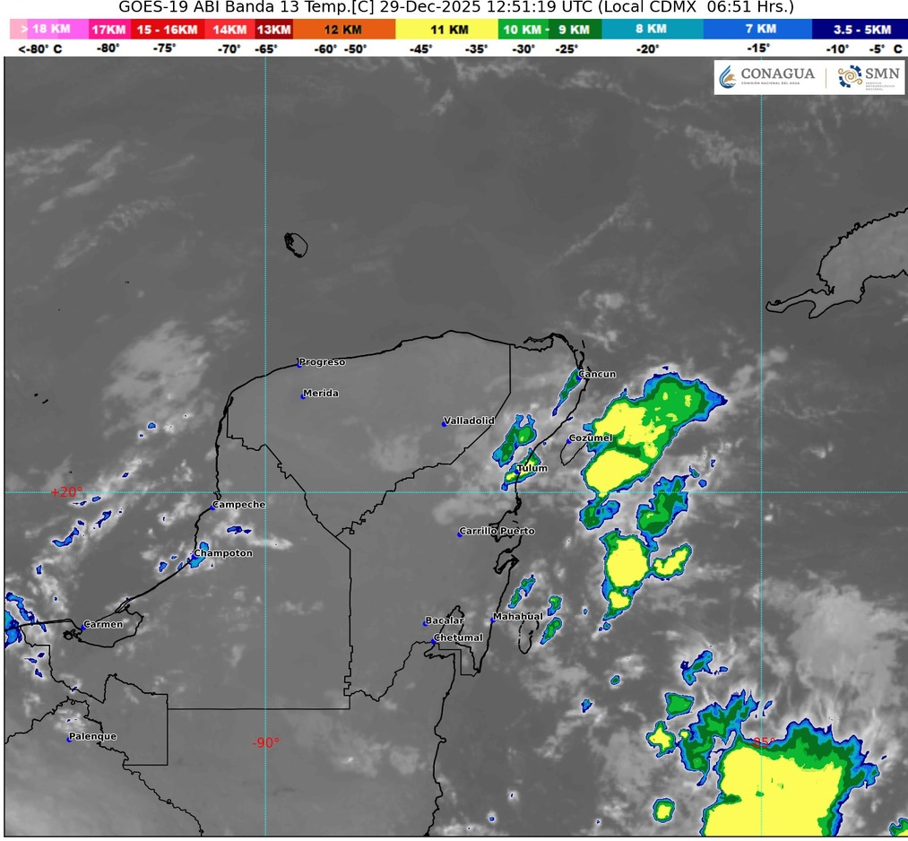 Este viernes 26 de diciembre, el estado de Quintana Roo amaneció con cielos mayormente nublados y lluvias intermitentes debido a la presencia de una vaguada que afecta gran parte de la Península de Yucatán. El ambiente se mantiene templado, con temperaturas que oscilan entre los 26°C y 28°C, mientras que la sensación térmica es ligeramente menor por la humedad y los vientos del Este.
