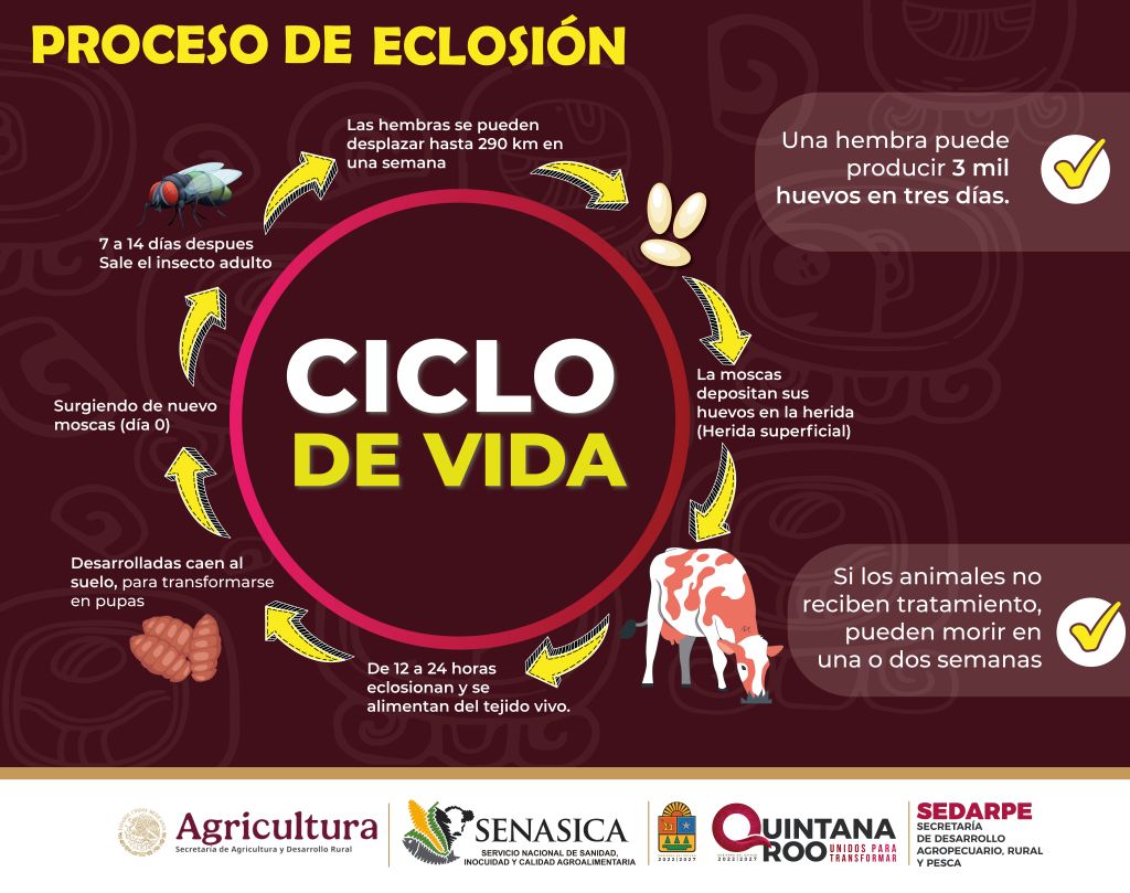 Aguilar Osorio hizo un llamado urgente a las y los ganaderos para revisar de manera constante a su ganado, especialmente heridas que puedan convertirse en focos de infestación. En caso de detectar larvas, se debe reportar de inmediato al SENASICA a los números oficiales, donde se ofrece atención inmediata y especializada.