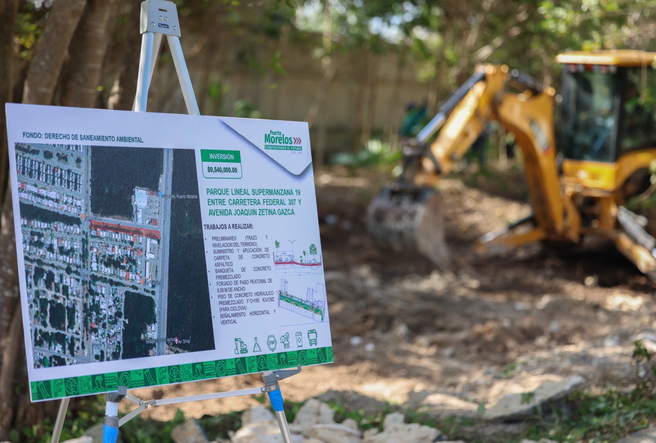 Puerto Morelos, Quintana Roo, 22 de diciembre de 2025.— La presidenta municipal Blanca Merari Tziu Muñoz anunció el inicio de la construcción del Parque Lineal en la Supermanzana 19, un proyecto que marcará un antes y un después en la vida urbana de la comunidad. Con una inversión de 9 millones 534 mil 877 pesos, la obra busca convertir un espacio deteriorado y subutilizado en un entorno público seguro, funcional y estéticamente atractivo.