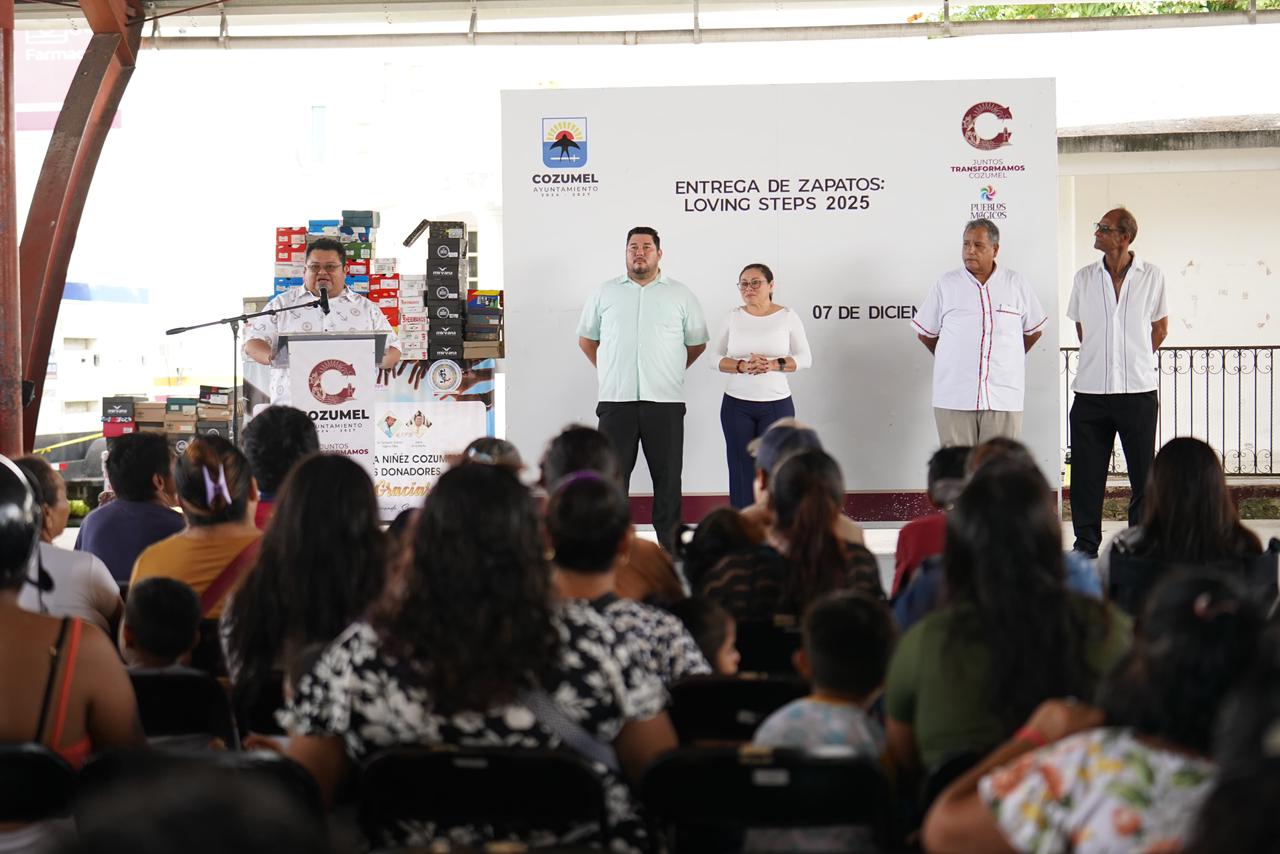 Cozumel, 7 de diciembre de 2025.- Bajo el domo del parque San Gervasio se vivió una jornada marcada por la unión y la esperanza, con la entrega anual de zapatitos “Loving Steps 2025”. El presidente municipal José Luis Chacón Méndez, acompañado de su esposa Diana Sosa Blanco, presidenta honoraria del DIF Cozumel, encabezó el evento junto a Félix Sebastián Solís Frías, director general del Sistema DIF Cozumel; Jeff Hanson, fundador de Loving Steps A.C.; y Fernando Segovia, presidente de la misma asociación.
