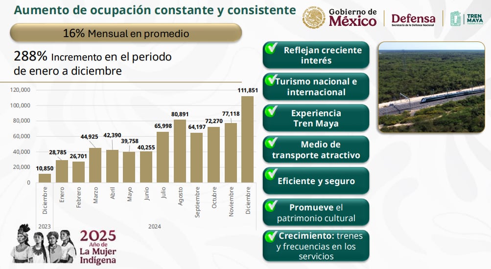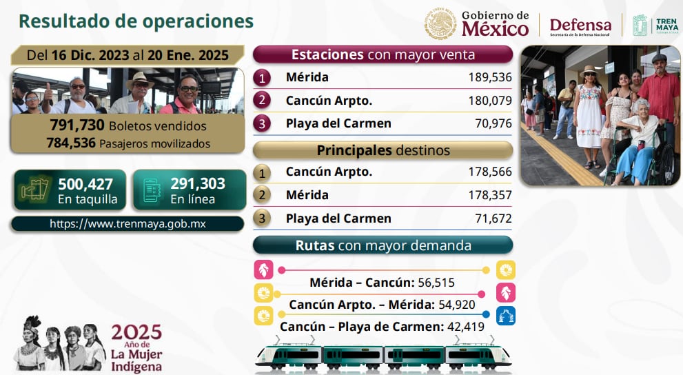 Señaló que ya cuatro de cada 10 boletos se venden en el portal web del Tren Maya (www.trenmaya.gob.mx). Las estaciones con mayor venta son Mérida, Cancún Aeropuerto y Playa del Carmen.
