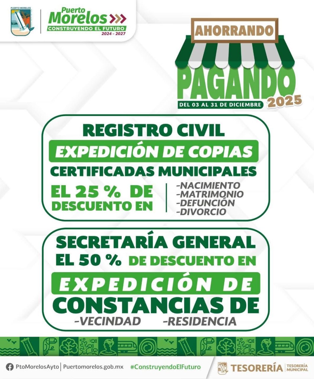 Puerto Morelos, Quintana Roo, 14 de diciembre de 2025.– Con un firme llamado a la responsabilidad ciudadana y al fortalecimiento de la economía familiar, la presidenta municipal Blanca Merari Tziu Muñoz invitó a las y los portomorelenses a aprovechar los últimos 15 días de la campaña de descuentos en contribuciones “Ahorrando Pagando 2025”.