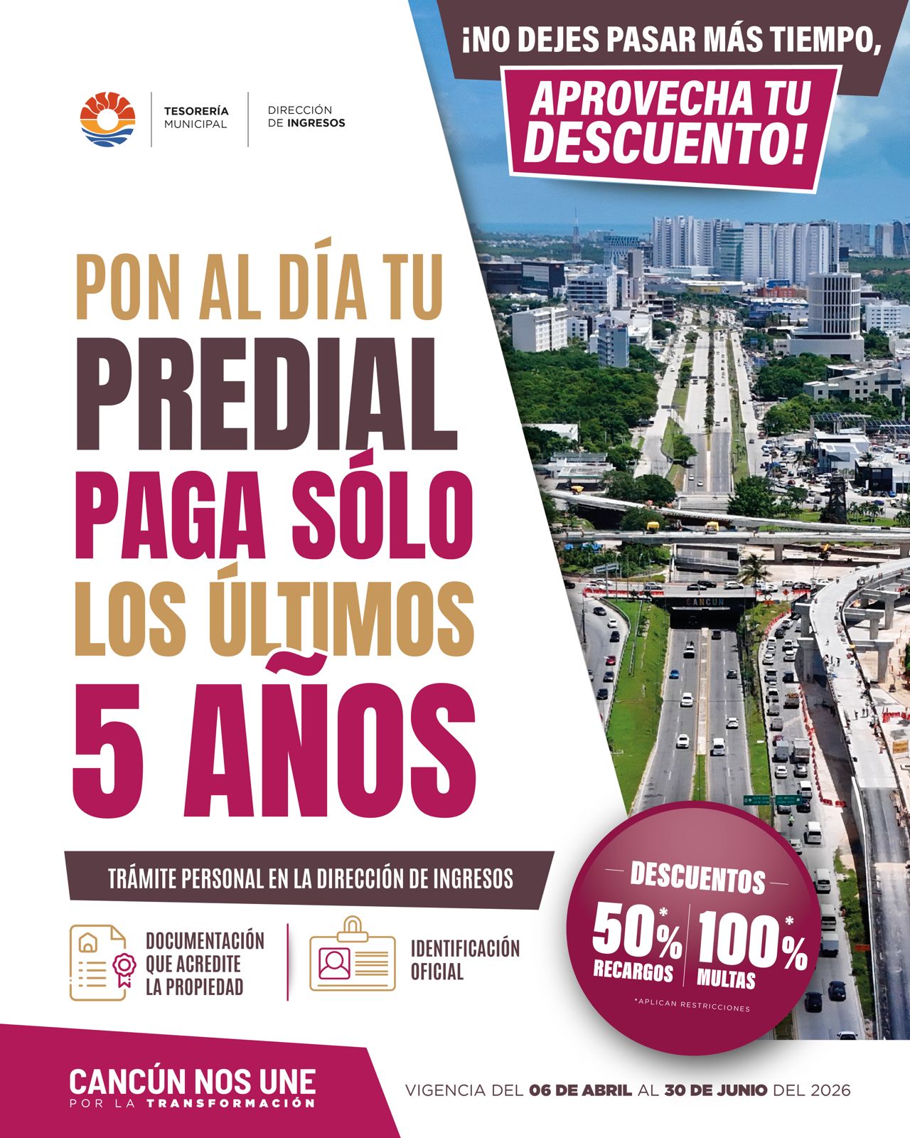 Cancún, Q. R., 05 de abril de 2026.— La presidenta municipal Ana Paty Peralta hizo un llamado a la ciudadanía para aprovechar el mecanismo de prescripción del impuesto predial, una herramienta legal que permite a las y los contribuyentes ponerse al día con sus obligaciones fiscales pagando únicamente los últimos cinco años de adeudo, sin importar el monto acumulado con anterioridad.
