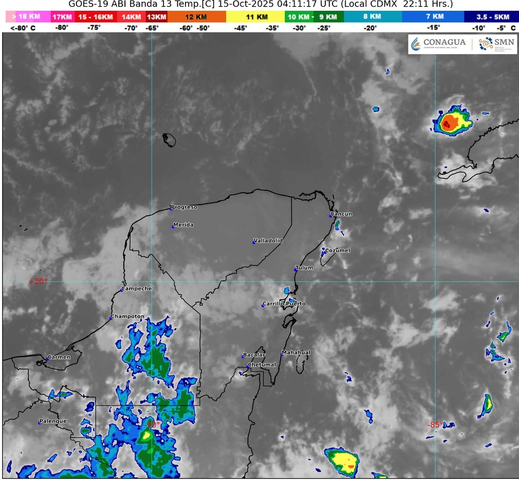 Chetumal, Q. Roo — 15 de octubre de 2025. Este miércoles, Quintana Roo se encuentra bajo condiciones meteorológicas inestables debido a la interacción de canales de baja presión y humedad proveniente del Caribe. Se esperan cielos nublados, lluvias dispersas y temperaturas cálidas, con sensaciones térmicas elevadas en varios municipios.