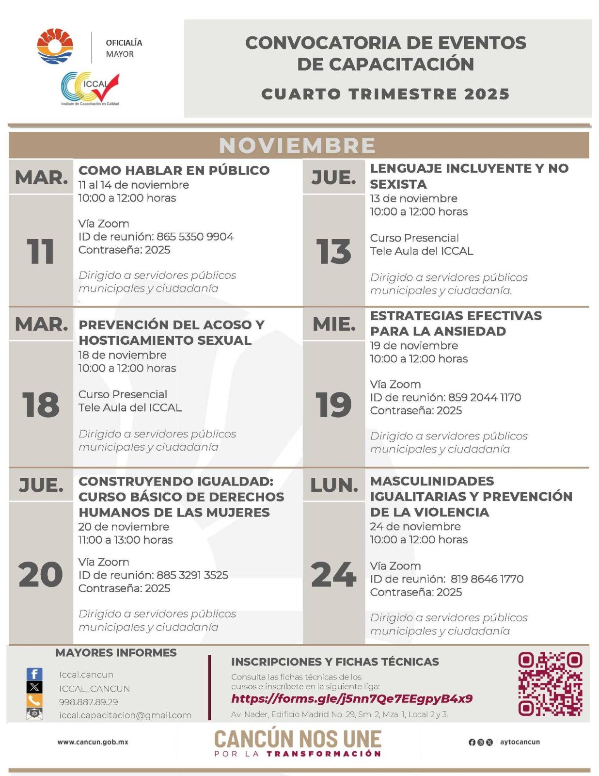 Estas acciones forman parte del compromiso institucional por erradicar la violencia de género desde la educación y la sensibilización comunitaria. Las personas interesadas pueden inscribirse en este enlace o consultar los canales oficiales del ICCAL: Facebook (Iccal.cancun), X (@ICCAL_CANCUN), teléfono 998 887 89 29 y correo electrónico iccal.capacitacion@gmail.com.
