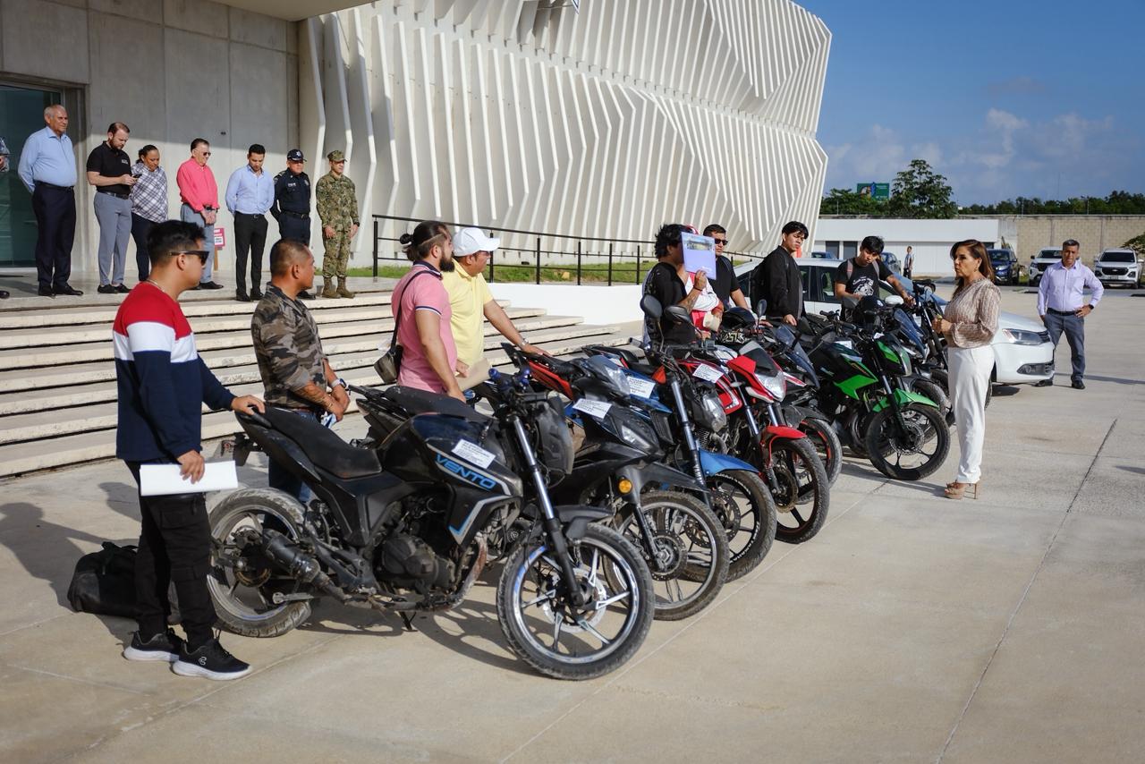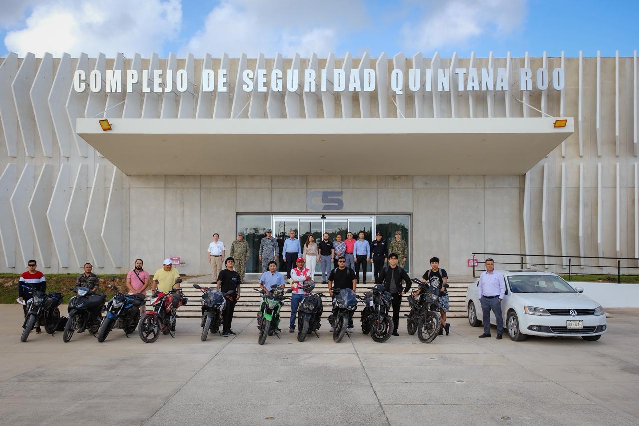 Cancún.– En una ceremonia solemne realizada en las instalaciones del C5, la gobernadora de Quintana Roo, Mara Lezama Espinosa, entregó 11 vehículos recuperados a sus legítimos propietarios, entre ellos 10 motocicletas y un automóvil. Estas unidades fueron aseguradas gracias a operativos coordinados entre la Fiscalía General del Estado (FGE), la Policía Municipal de Cancún y la Policía Estatal, como parte de las acciones permanentes contra el robo de vehículos y la inseguridad.
