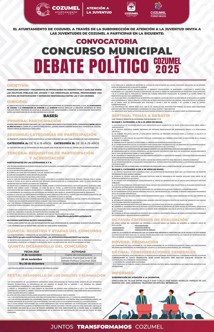 Con esta convocatoria, el gobierno municipal reafirma su compromiso con el desarrollo cívico de las juventudes, generando espacios donde puedan construir propuestas, dialogar con respeto y contribuir al fortalecimiento democrático de Cozumel.