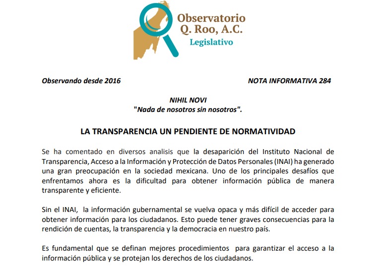 LA 18ª LEGISLATURA INCUMPLE CON DESAPARICIÓN DEL IDAIPQROO: OBSERVATORIO