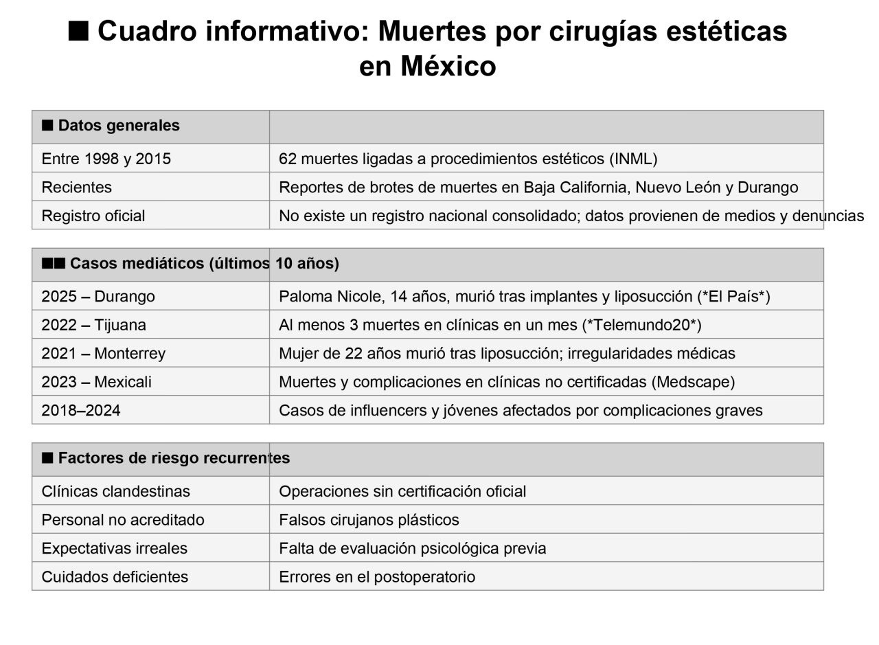 Por ejemplo, en agosto de 2022 en Tijuana se reportaron al menos tres muertes en clínicas estéticas durante un corto periodo, lo que encendió alertas sobre el turismo médico mal regulado. Uno de los más sonados recientemente es el caso de Paloma Nicole, una adolescente de 14 años en Durango, quien falleció tras una operación estética (implantes y liposucción), generando indignación sobre intervenciones en menores.