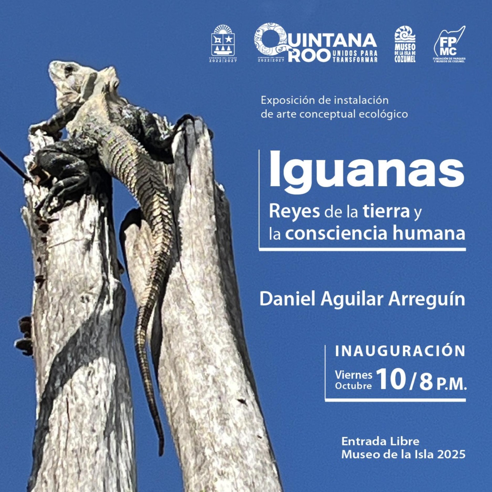 Cozumel, Q. Roo.— La Fundación de Parques y Museos de Cozumel (FPMC) reafirma su compromiso con el arte contemporáneo y la conciencia ambiental al presentar la exposición “Iguanas: Reyes de la Tierra y la Consciencia Humana”, del reconocido artista multidisciplinario Daniel Aguilar Arreguín. La inauguración se llevará a cabo el viernes 10 de octubre a las 20:00 horas en el Museo de la Isla.