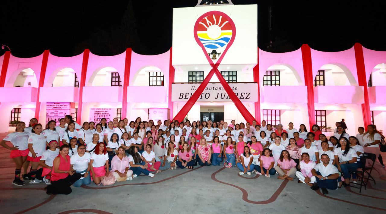 El Palacio Municipal fue iluminado en un vibrante tono rosa, símbolo de esperanza y lucha, en una ceremonia que incluyó actividades físicas, testimonios de sobrevivientes, el toque de campana de la esperanza por parte de siete mujeres de la Fundación Lazos de Vida, y la proyección del video mapping “Pink Power”.